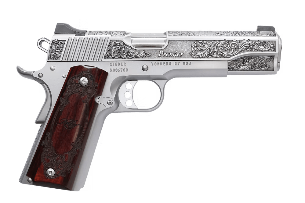 KIMBER 1911 PREMIER 45ACP PISTOL 5″ STAINLESS ENGRAVED, ENGRAVED ROSEWOOD GRIP 1-7RD 1 OF 200